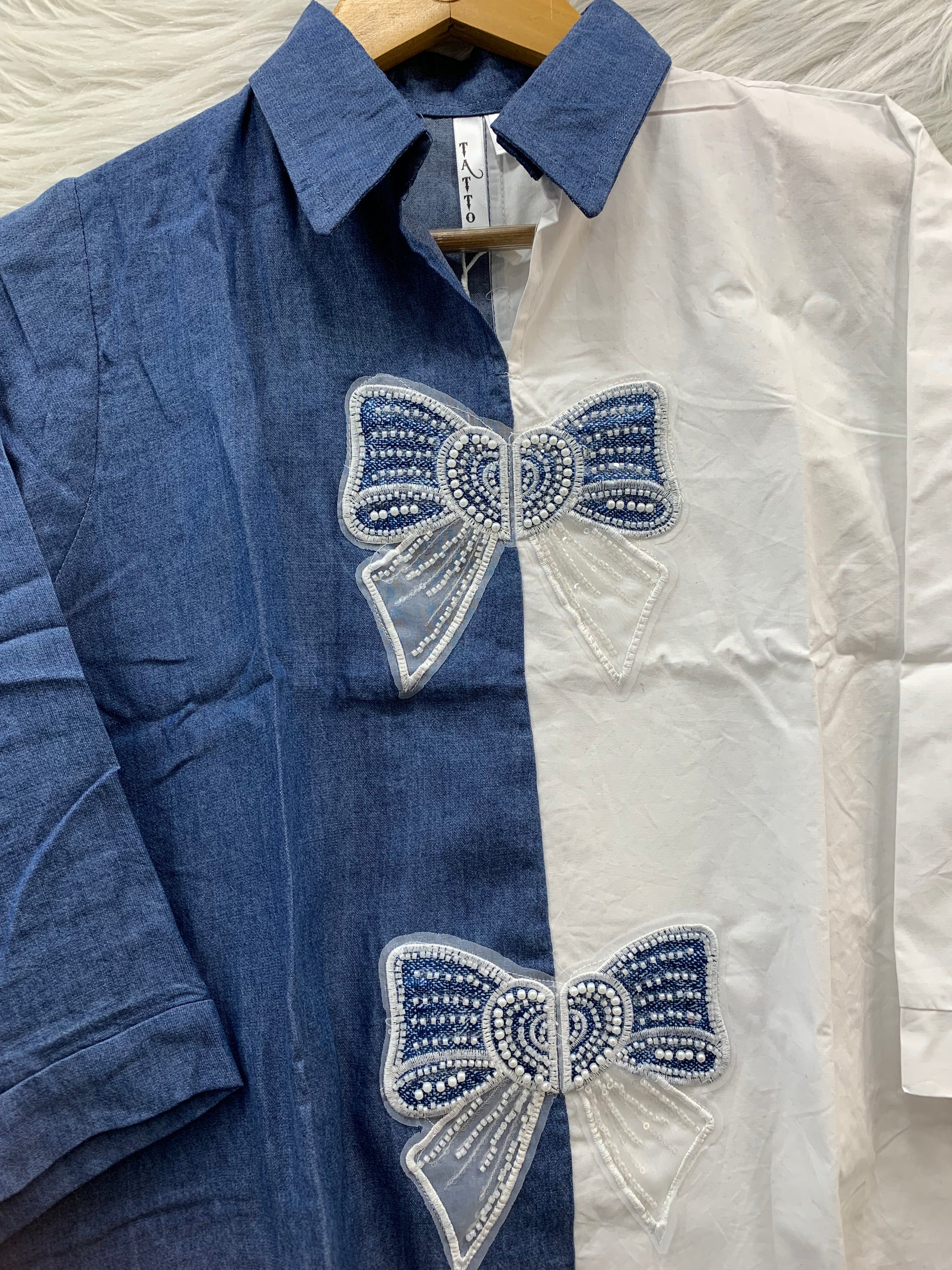 A stylish dual-tone summer denim top with delicate bow detailing, offering a breathable fabric and effortless everyday elegance.